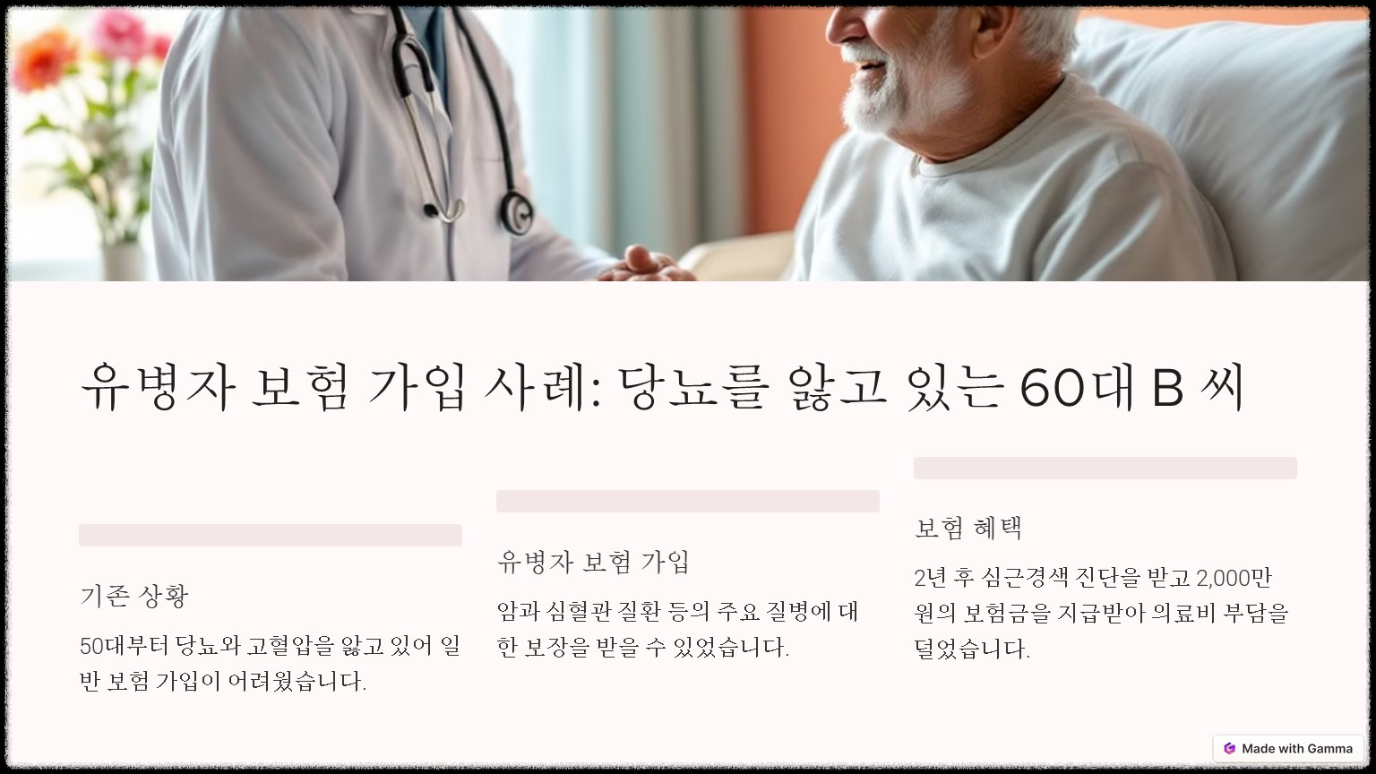 B 씨는 50대부터 당뇨를 앓고 있었고, 고혈압도 있어 일반 보험 가입이 어려운 상황이었습니다. 기존 보험사들은 그의 병력을 이유로 가입을 거절하거나, 가입이 가능하더라도 보장 범위를 제한했습니다. 하지만 유병자 보험을 통해 그는 암과 심혈관 질환 등의 주요 질병에 대한 보장을 받을 수 있었으며, 실제로 2년 후 심근경색 진단을 받고 치료를 받을 때 2,000만 원의 보험금을 지급받아 의료비 부담을 덜 수 있었습니다.