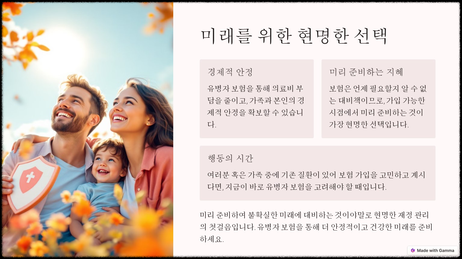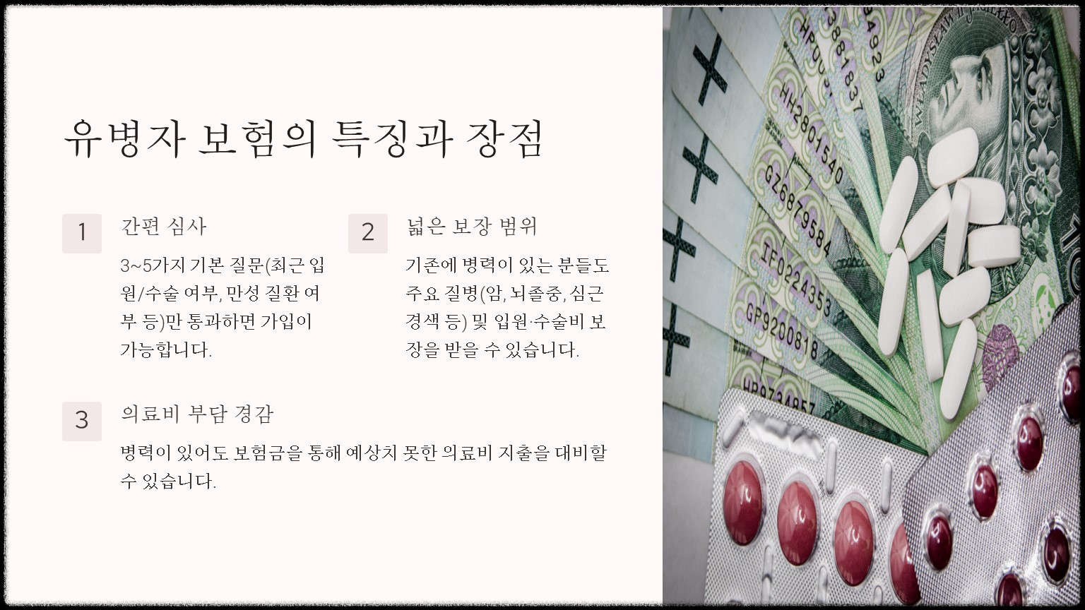 - 의료비 부담 경감: 병력이 있어도 보험금을 통해 예상치 못한 의료비 지출을 대비할 수 있습니다.